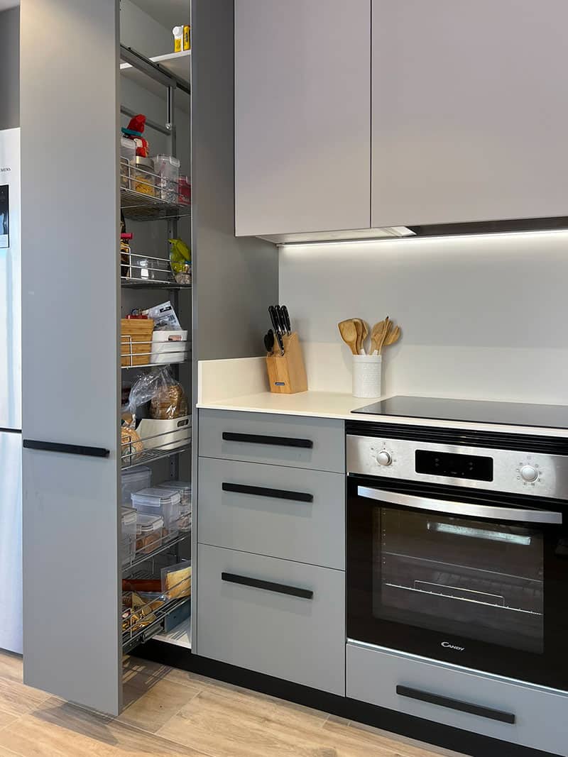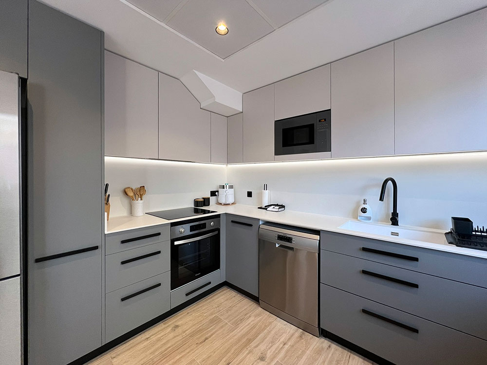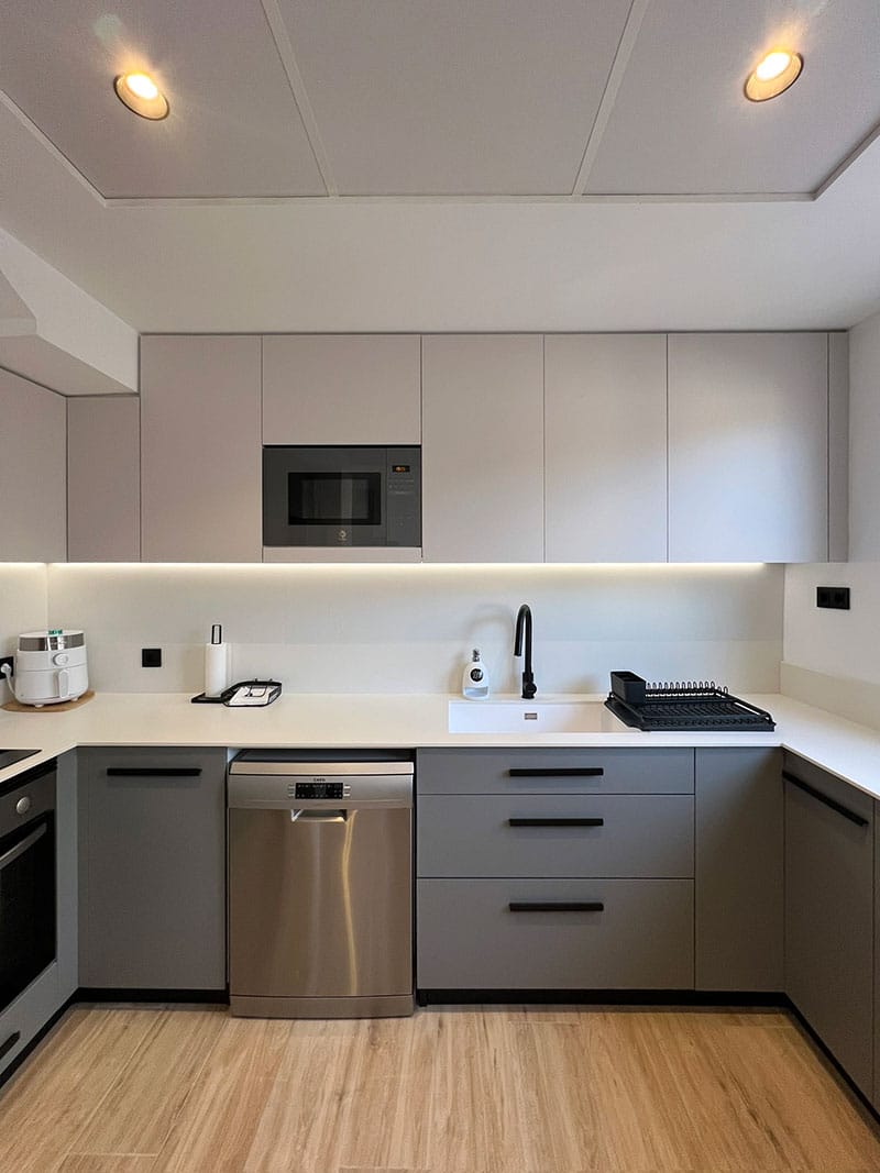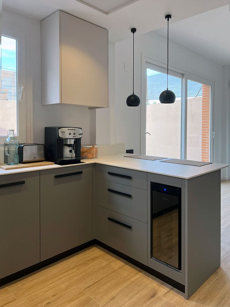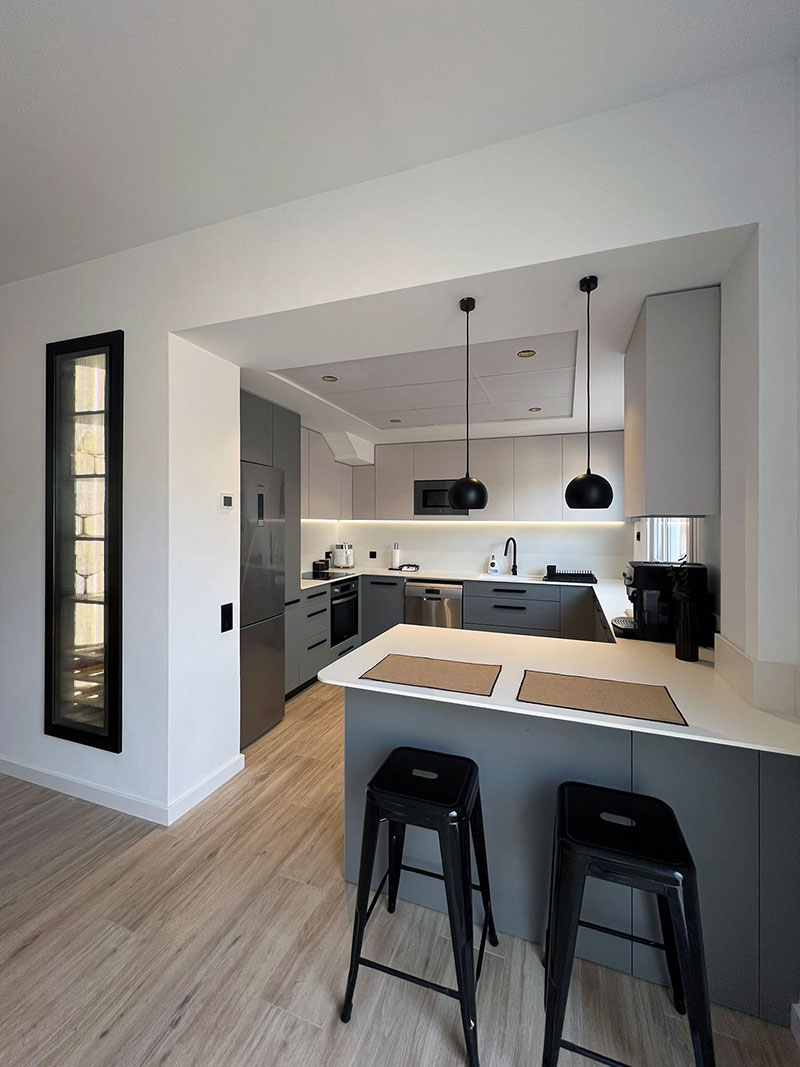 La nueva distribución incluyó una península que sirve como barra, ideal para disfrutar de un café o una copa de vino. La cocina se diseñó con un elegante contraste de tonos sobrios en los muebles, complementados por herrajes en color negro, aportando un toque de sofisticación y modernidad.