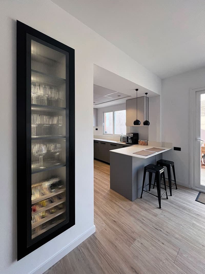 Además, aprovechamos un espacio que estaba oculto entre la estructura y la pared para incorporar un botellero y un mueble para copas, añadiendo funcionalidad y estilo al conjunto.