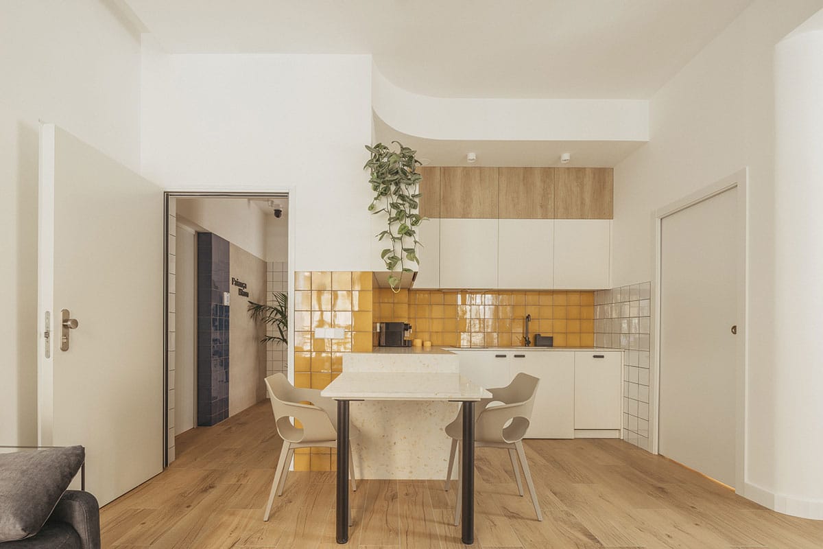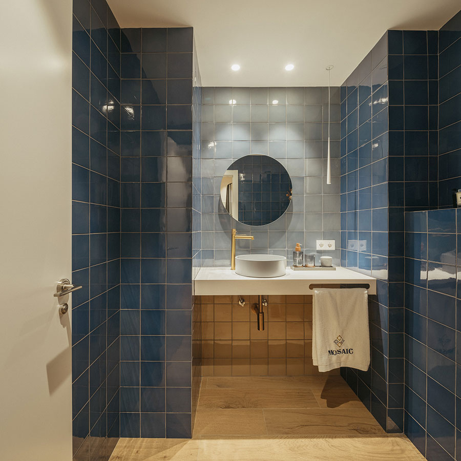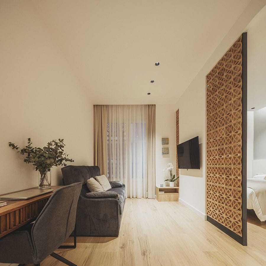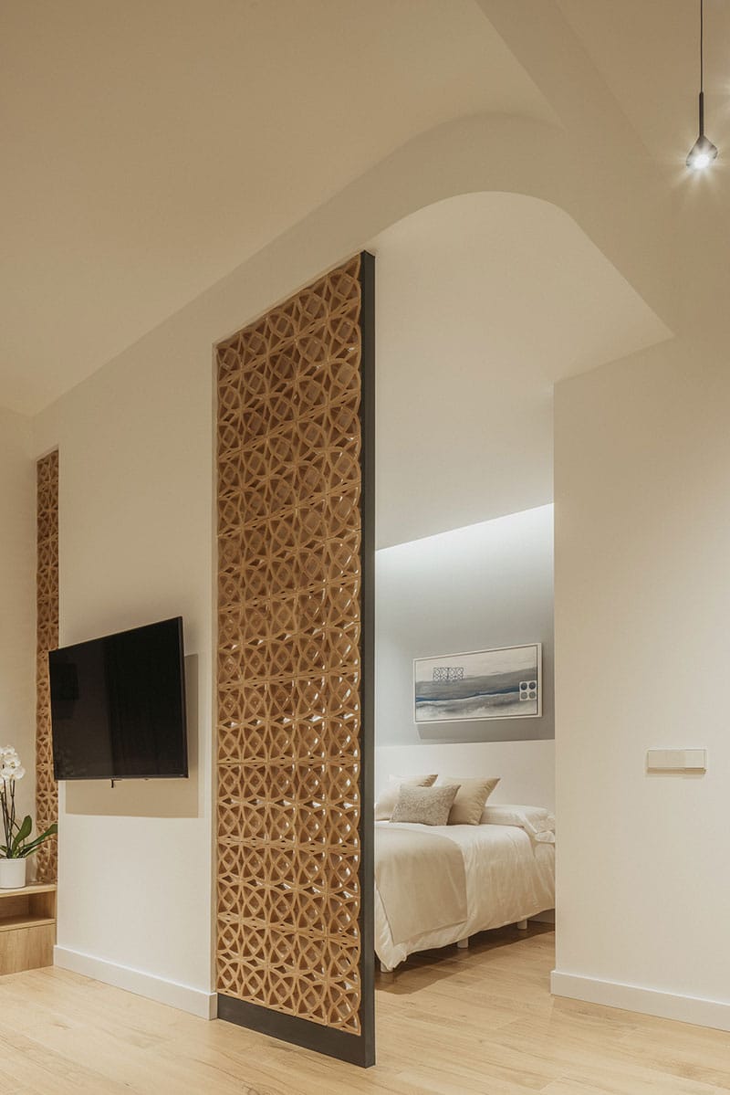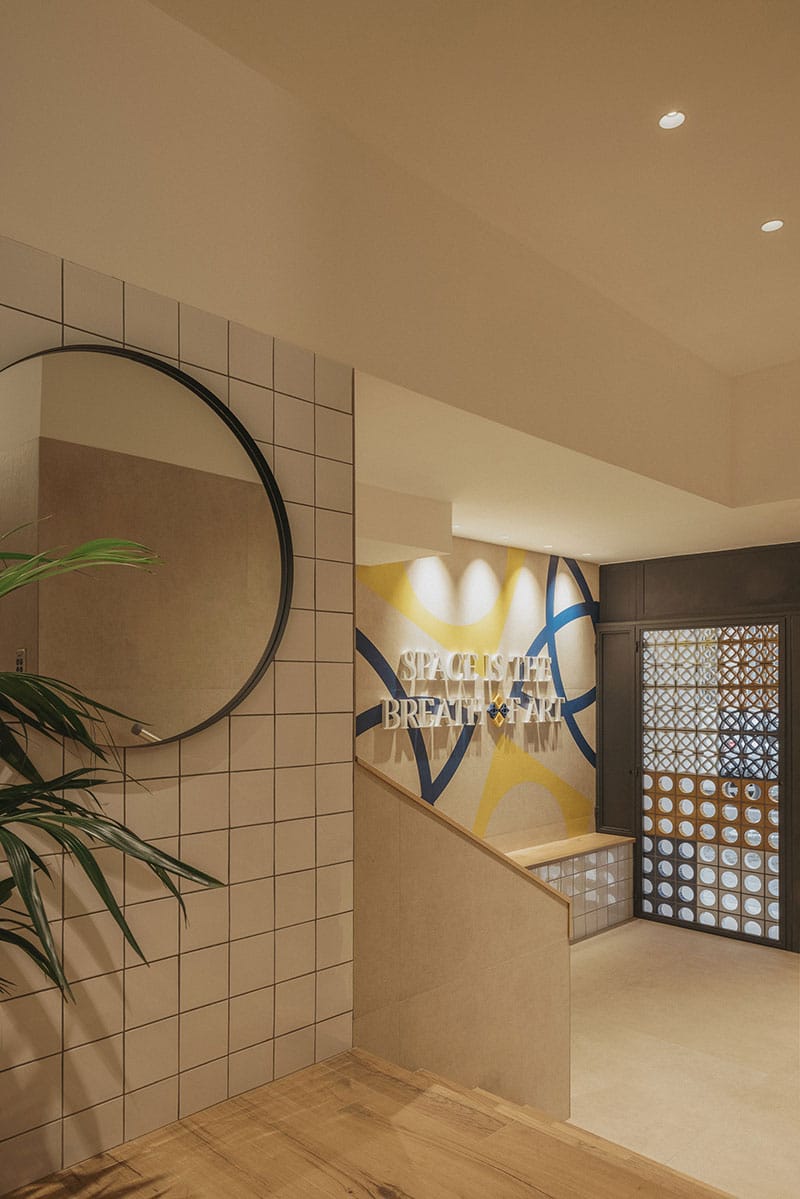 El diseño incorpora materiales tradicionales como cerámica y celosías, y colabora con artistas y creativos locales para construir una identidad visual coherente y profundamente arraigada en el lugar. También se han cuidado los recorridos y transiciones entre lo público y lo privado, desde el acceso en calle hasta el descanso en el dormitorio, con filtros visuales que amplían la percepción espacial y conectan estancias mediante mobiliario, transparencias y distintas alturas.