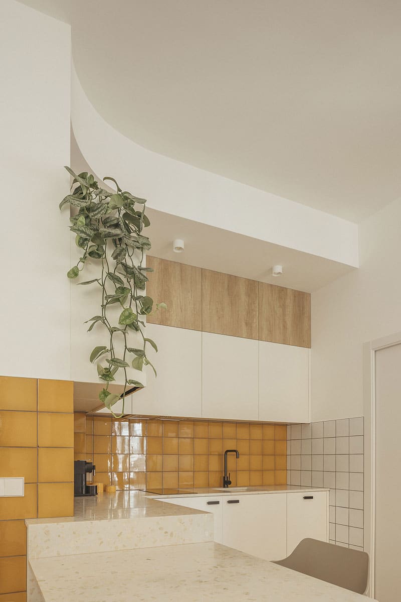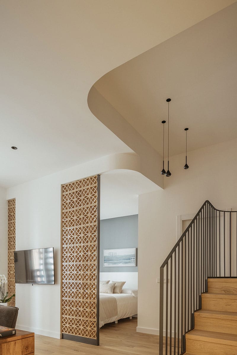 En apenas 120 m² se articula un espacio de entrada accesible que resuelve el desnivel con respecto a la calle y organiza el acceso a los dos apartamentos: uno de ellos adaptado para personas con movilidad reducida, y el otro aprovechando los diferentes niveles del local con una distribución en doble altura. Los techos curvos acompañan el recorrido y la identificación de las estancias, y refuerzan la fluidez espacial.