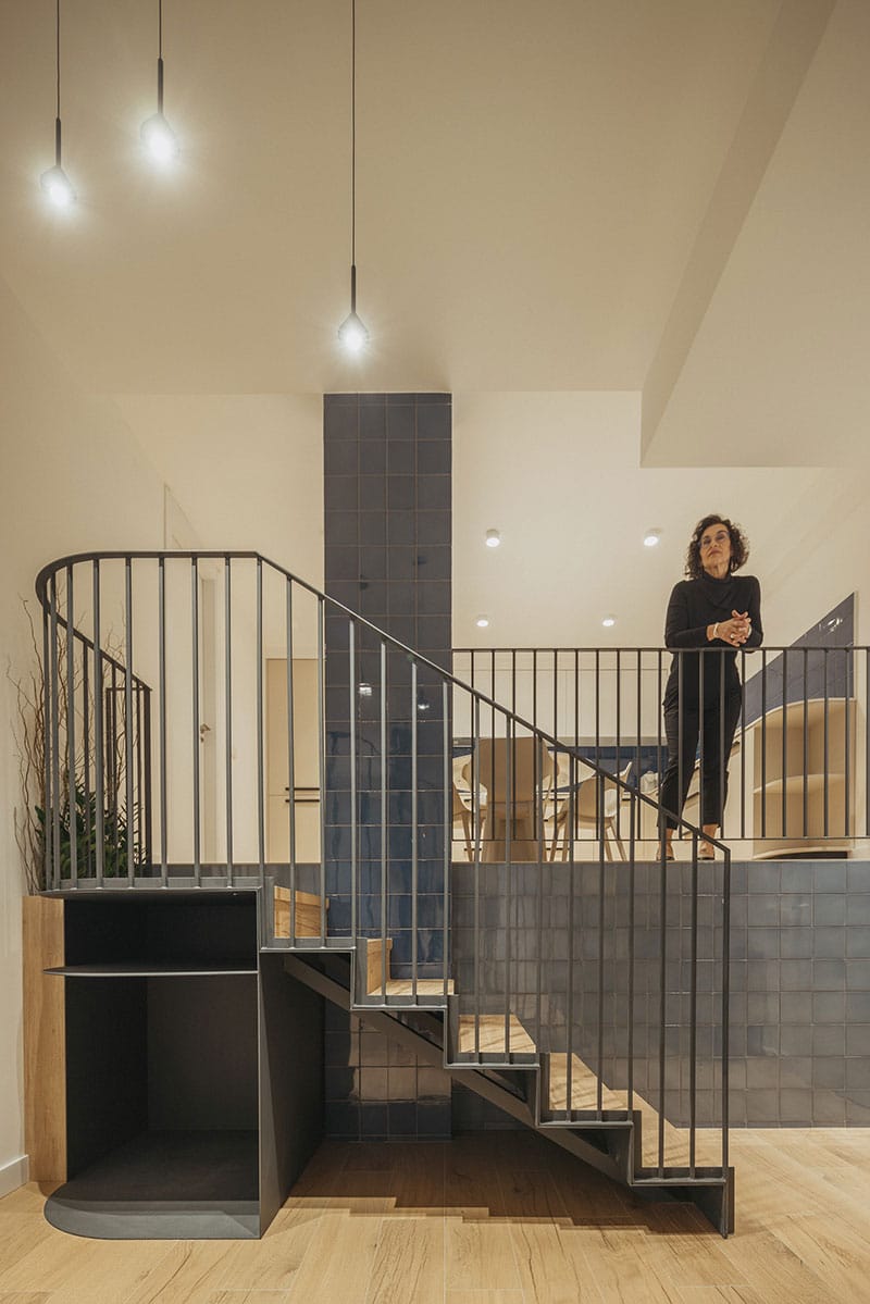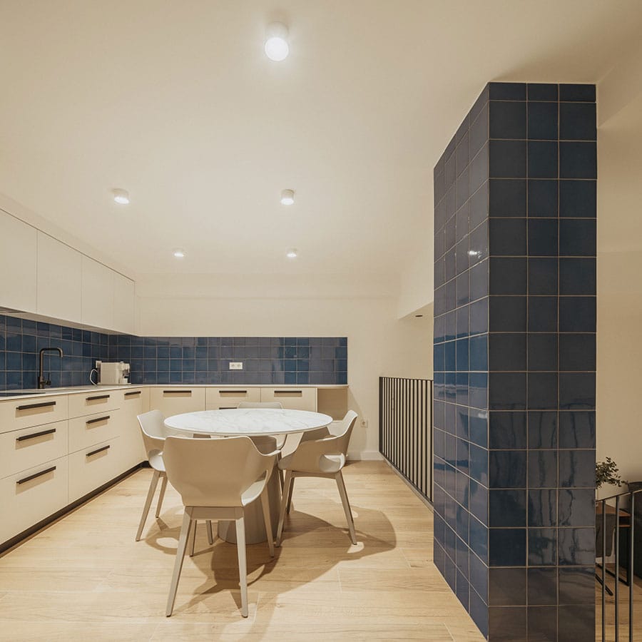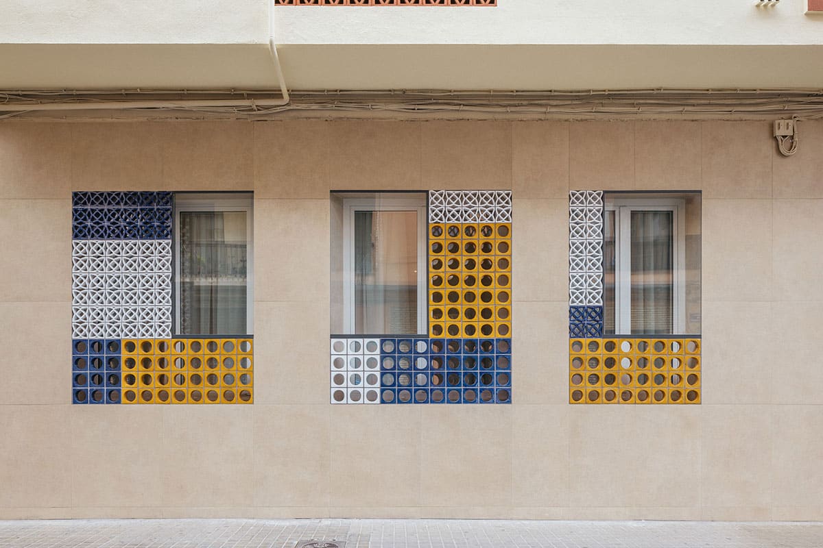 Desde el exterior, la intervención se integra con sutileza: la elevación respecto a la acera y los ventanales altos garantizan la privacidad, mientras que una puerta diseñada ad hoc y las celosías en colores que hacen referencia a la ciudad de Valencia (azul mar, blanco azahar y amarillo cítrico) aportan elegancia y vitalidad al entorno urbano.